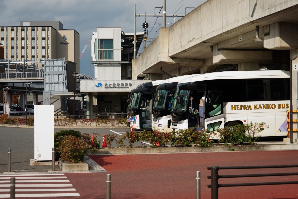 「旧二条駅舎」を左手にみつつ、扇形車庫に向かいます。