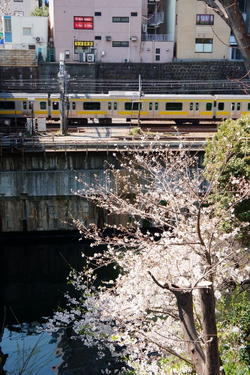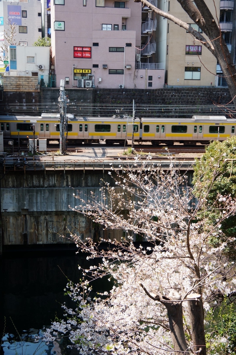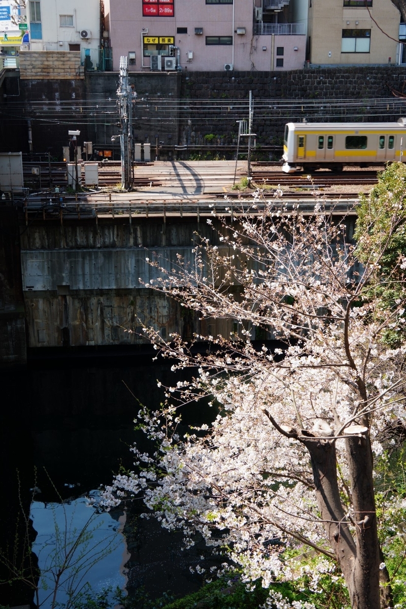 神田川をはさんだ総武線と桜の華麗なる競演