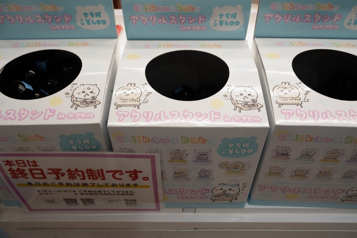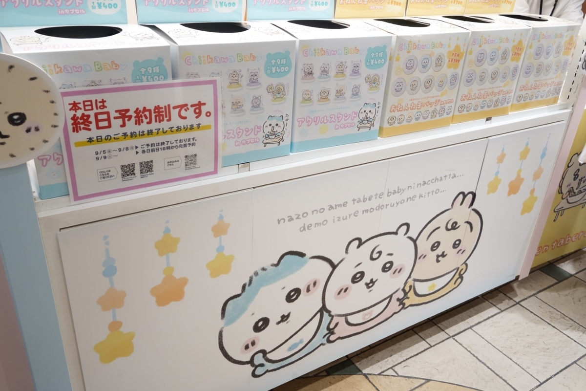 POP UPストアを出て、ちいかわらんどTokyo Stationの少し先にある缶バッジとアクリルスタンドの販売コーナー。こちらも予約制です。現金のみ使用可となっています。