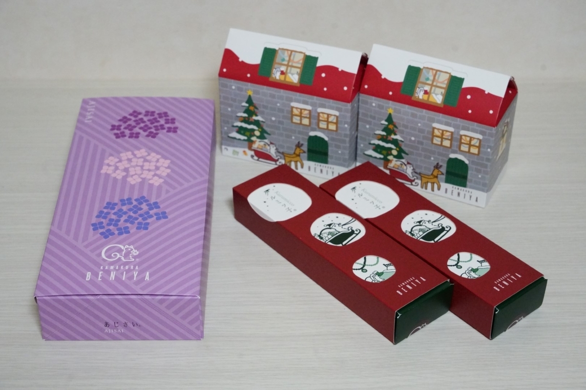 鎌倉紅谷にて購入品。クルミッ子8個入り×2、あじさい8枚入り、ハウス型BOX(2025クリスマス)×2
